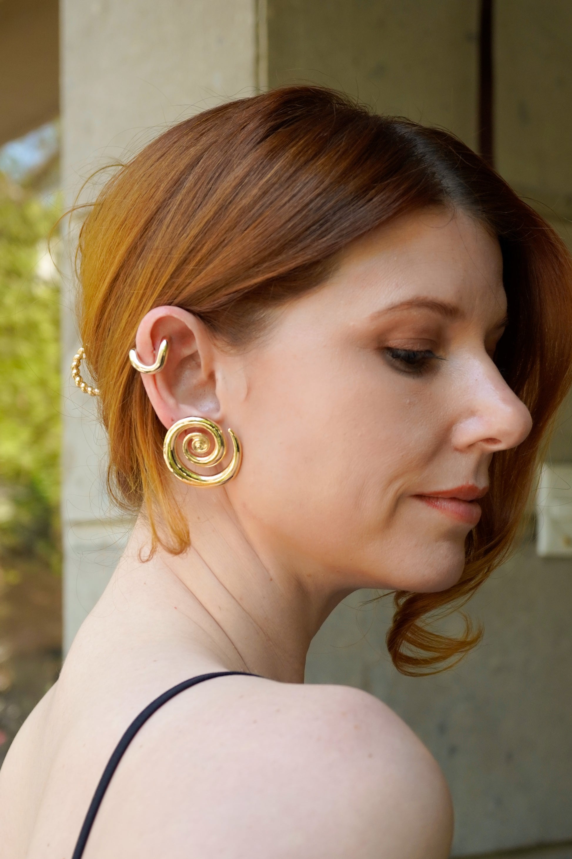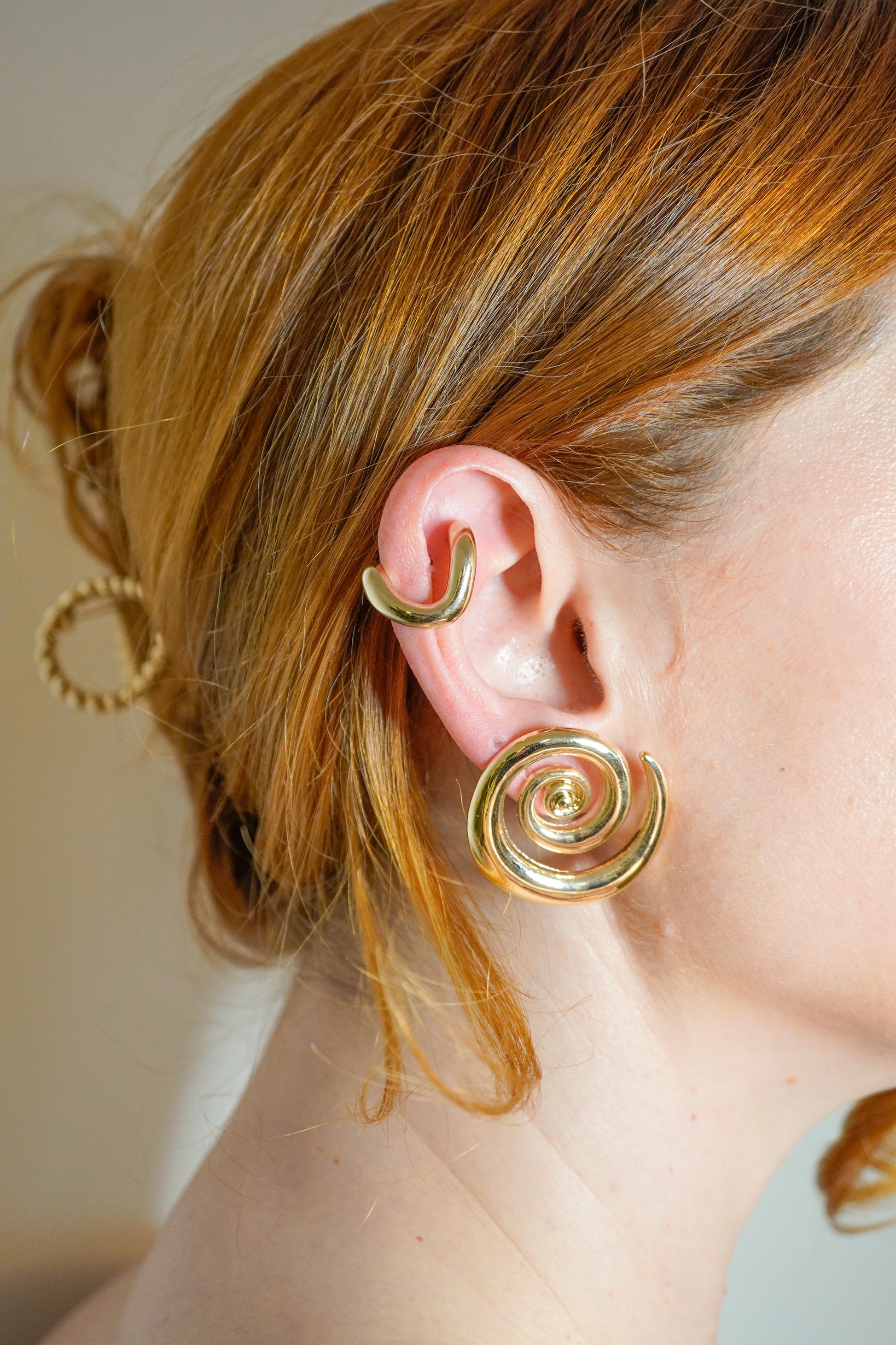 Los aretes Ariela destacan con su diseño en forma de espiral fluida, creando un efecto visual dinámico y cautivador. Su acabado brillante resalta cada curva, convirtiéndolos en una pieza única que celebra el movimiento y la energía.