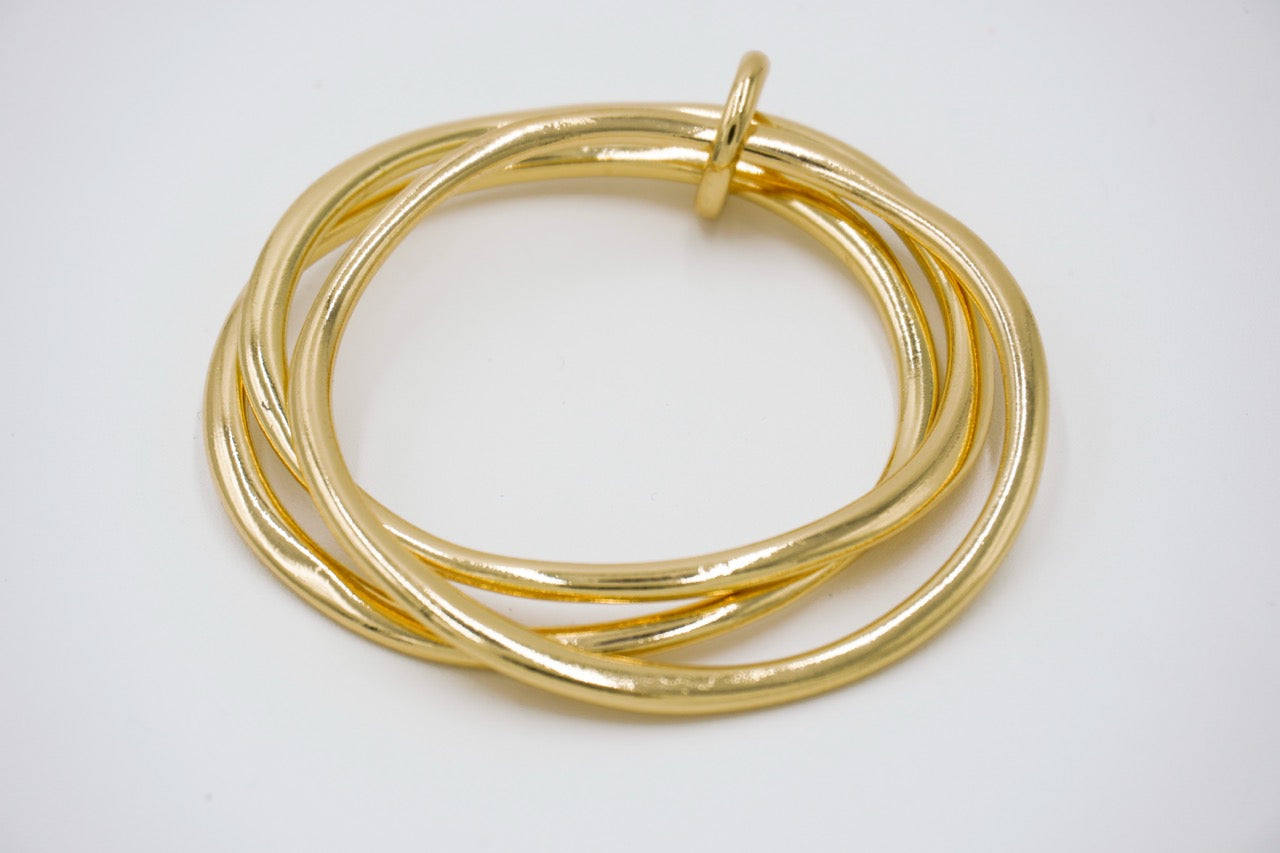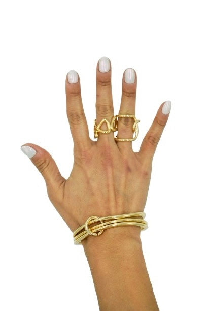 La pulsera Mara destaca por su diseño entrelazado de aros dorados, creando un juego visual dinámico y moderno. Cada anillo parece bailar en armonía, representando fluidez y conexión. Con esencia contemporánea es perfecta para quienes buscan un accesorio llamativo pero elegante.