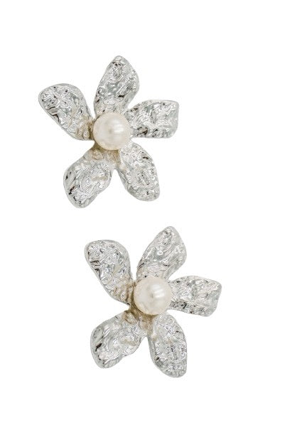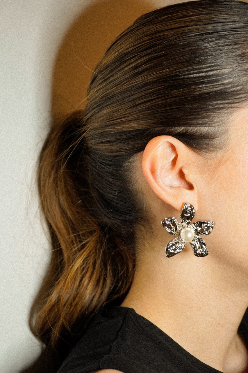 Los aretes Margot destacan por su diseño en forma de flor plateada texturizada, con una perla sintética en el centro. Su estilo único y atemporal los convierte en uno de los favoritos de la marca.