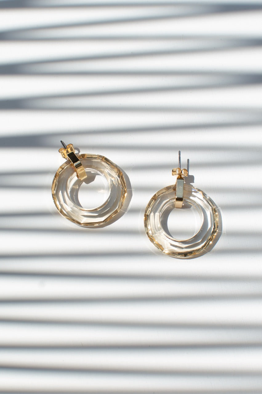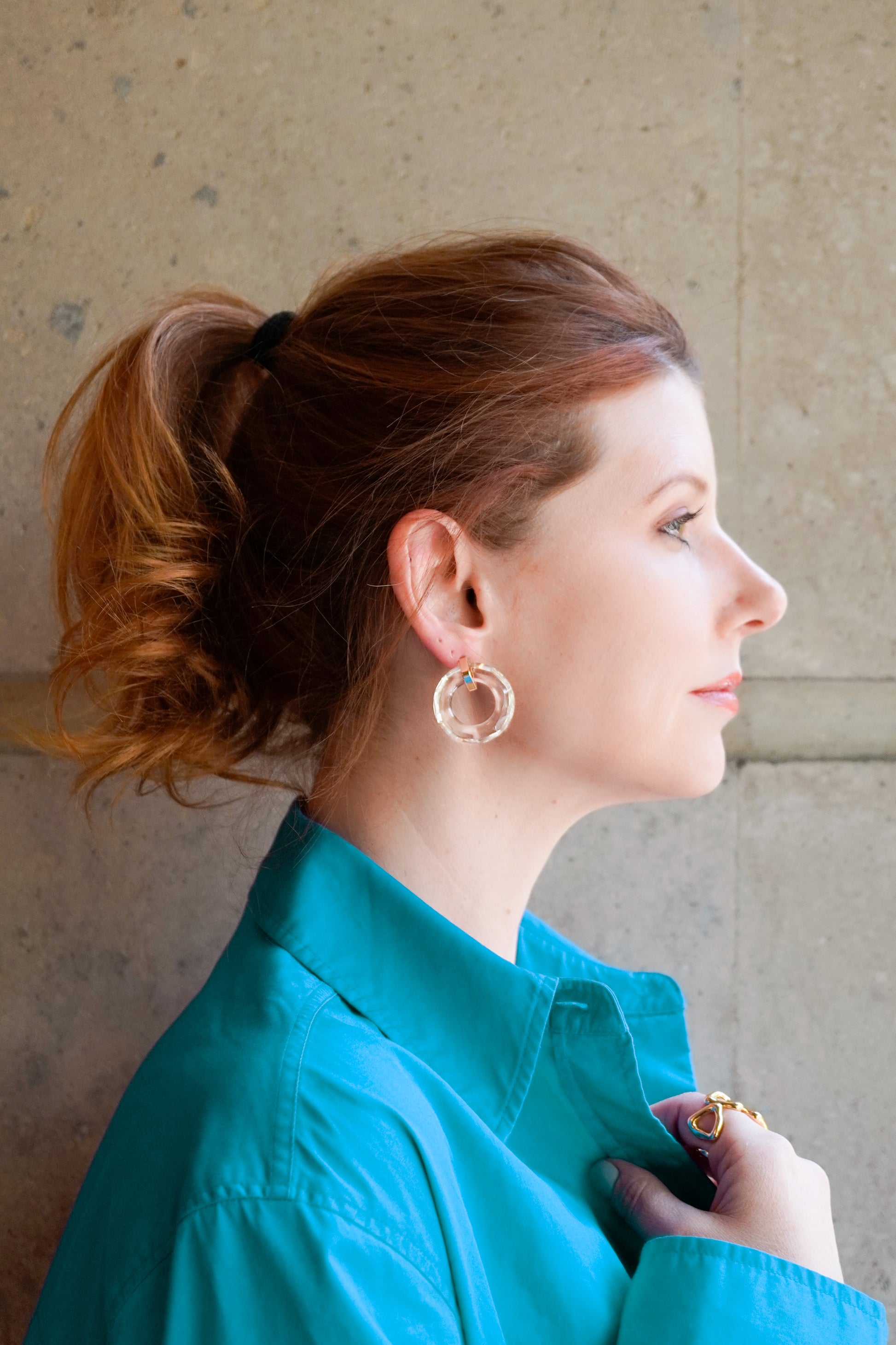 Los Aretes Nora destacan por su diseño único en vidrio facetado, que captura y refleja la luz de manera sutil y elegante. Su acabado transparente combinado con detalles dorados los convierte en el complemento perfecto para un look fresco y moderno, ideal para cualquier ocasión.