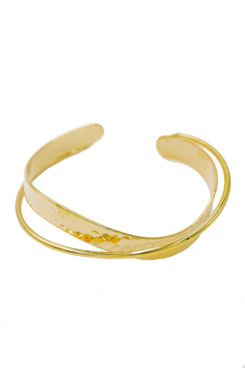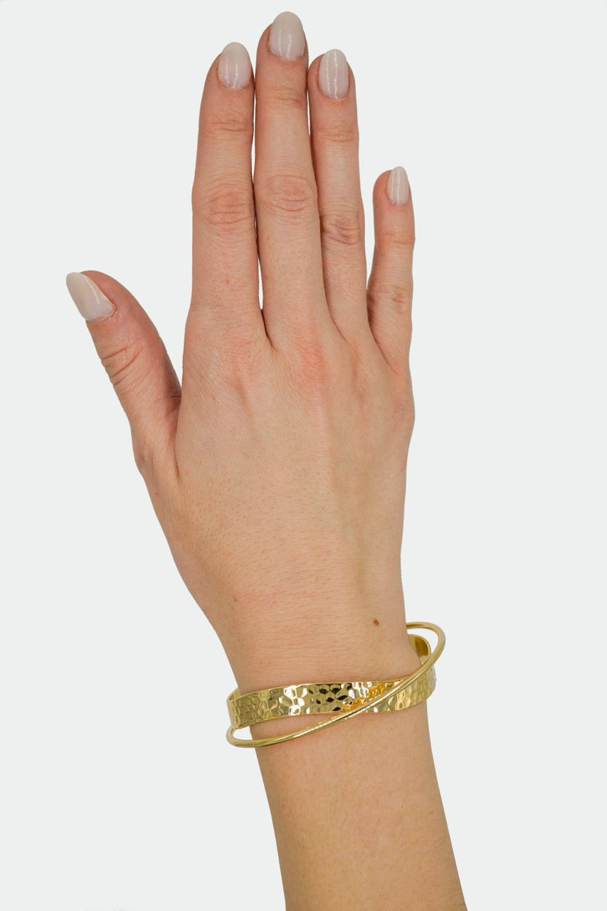 La Pulsera Orla destaca por su diseño entrelazado que combina curvas suaves y texturas martilladas. Su forma fluida y abierta le da un toque delicado pero moderno, perfecto para complementar cualquier estilo con sutileza y elegancia.