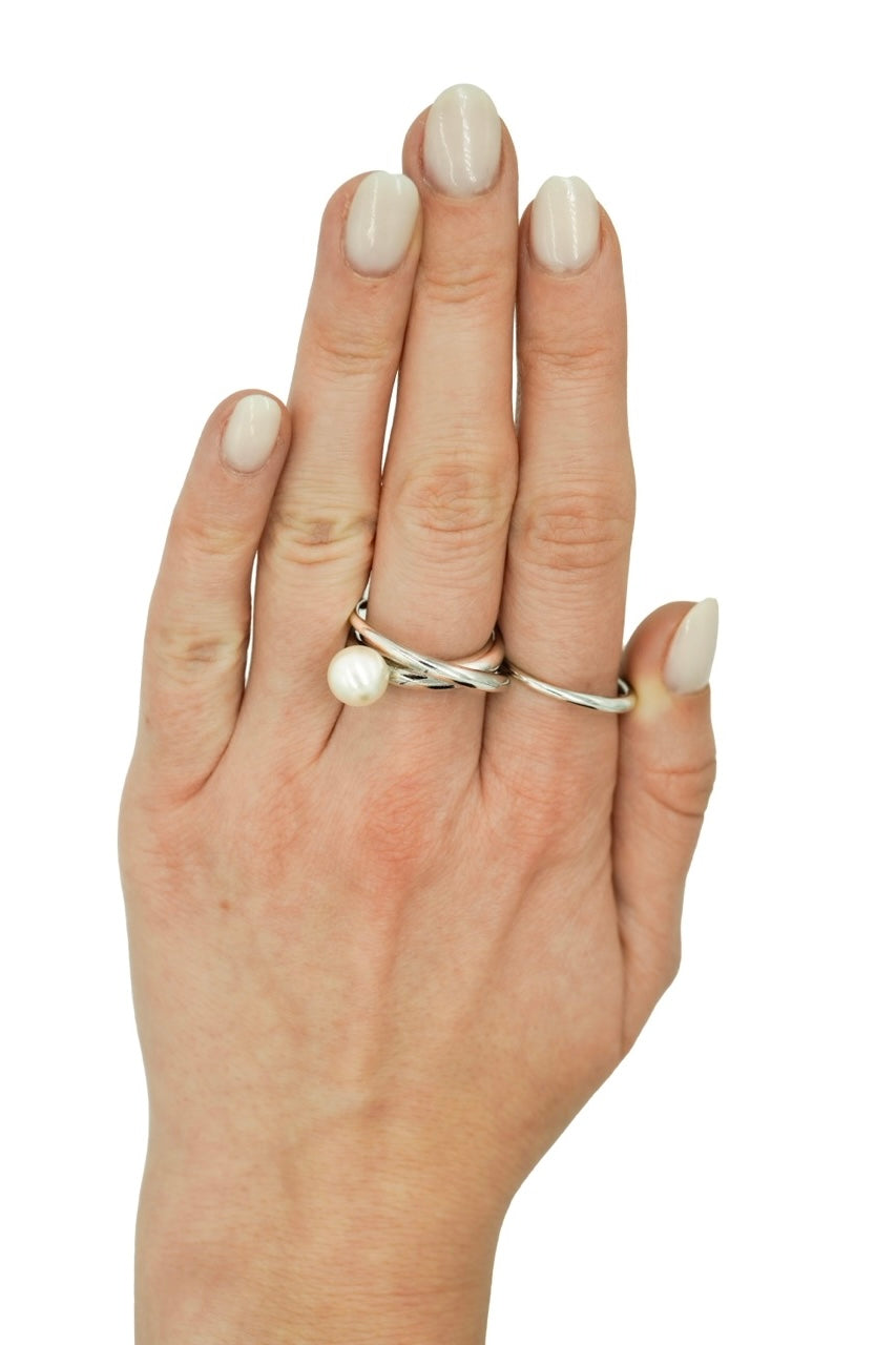 El anillo Sylvie es una pieza doble que se lleva en dos dedos, con un estilo que simplemente destaca. Su estructura en espiral, adornada con la delicadeza de una perla, aporta dinamismo y originalidad.